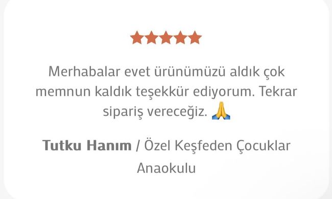“Merhabalar ben kurumda değilim ama ürünleri teslim almış öğretmenlerimiz ürünler çok güzel dediler çok teşekkür ediyorum ellerinize sağlık.”